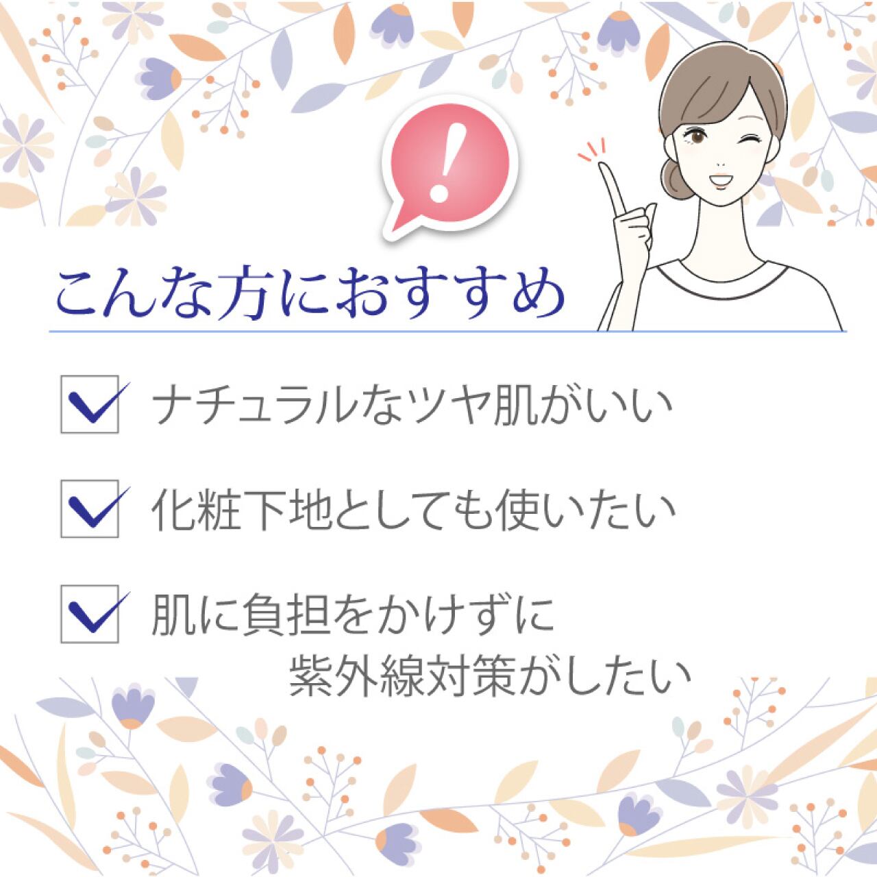 ナチュラルなツヤ肌を目指す方にほんのりとピンクベージュの色味の日焼け止めです。肌なじみが良く、気になるトラブルを目立ちにくくし、お化粧下地にもお使いいただけます。天然の植物エキス配合で、お肌をダメージから守ります。