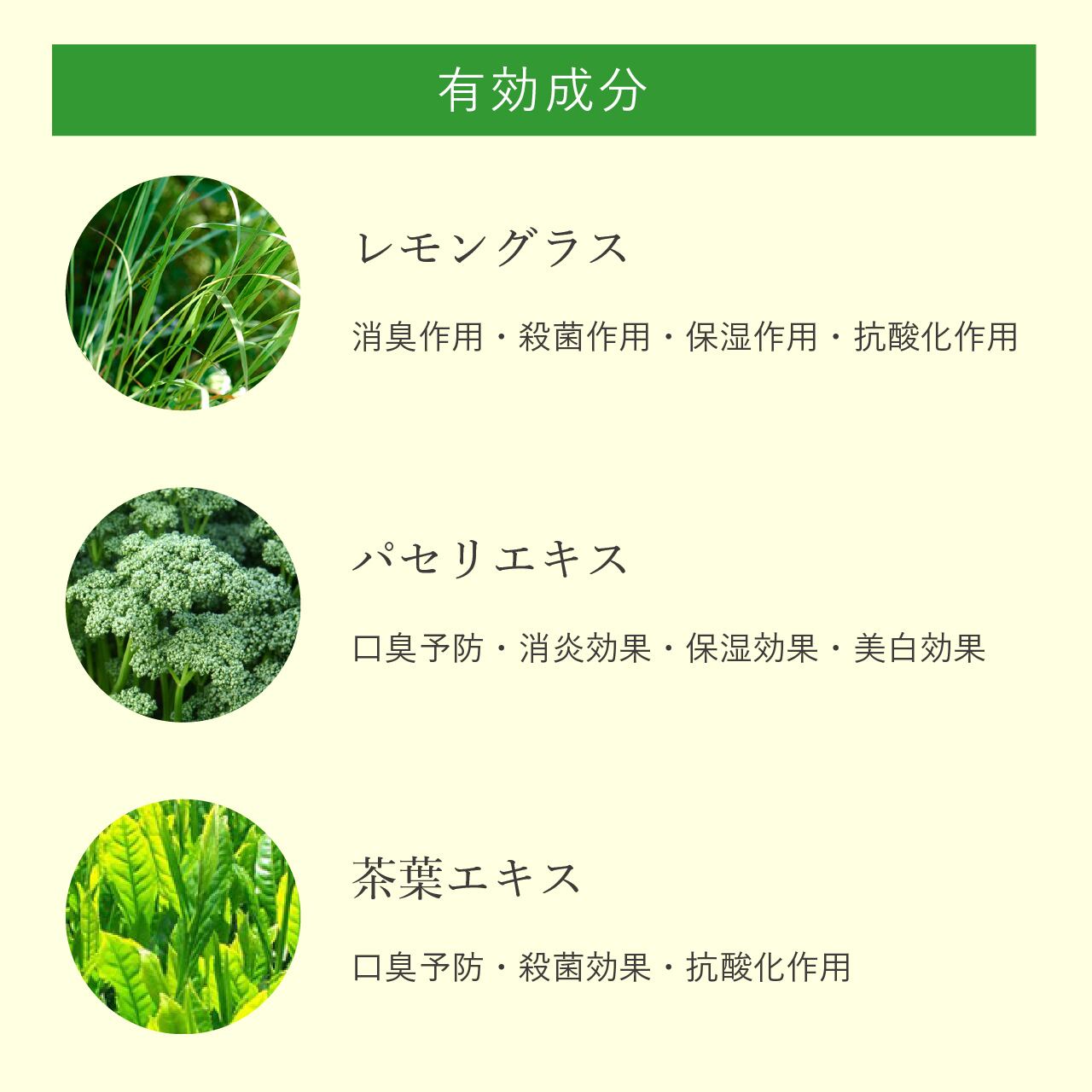 【原材料】ヒドロキシアパタイト、レモングラス葉/茎エキス、パセリエキス、チャ葉エキス、レモングラス油、スペアミント油・・・その他数種配合